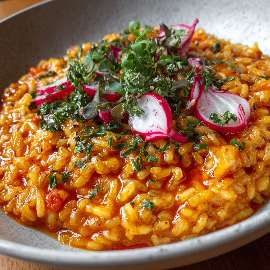This risotto is a star on its own, but pairing it with some crisp green vegetables or a light kimchi salad will cut through the creaminess and bring a refreshing brightness. Grilled shrimp or seared tofu also complement the fusion flavors, turning your meal into an impressive feast.
