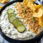 This Fried Pickle Ranch Dip is a creamy, tangy, and crunchy appetizer perfect for any gathering. It features a blend of whipped cream cheese, sour cream, fresh dill, chives, and garlic, combined with finely chopped dill pickles and ranch seasoning, then mixed with golden toasted panko breadcrumbs for texture. Chilled to develop flavors, it makes a delightful dip for chips, pretzels, veggies, or as a spread for sandwiches and wraps.