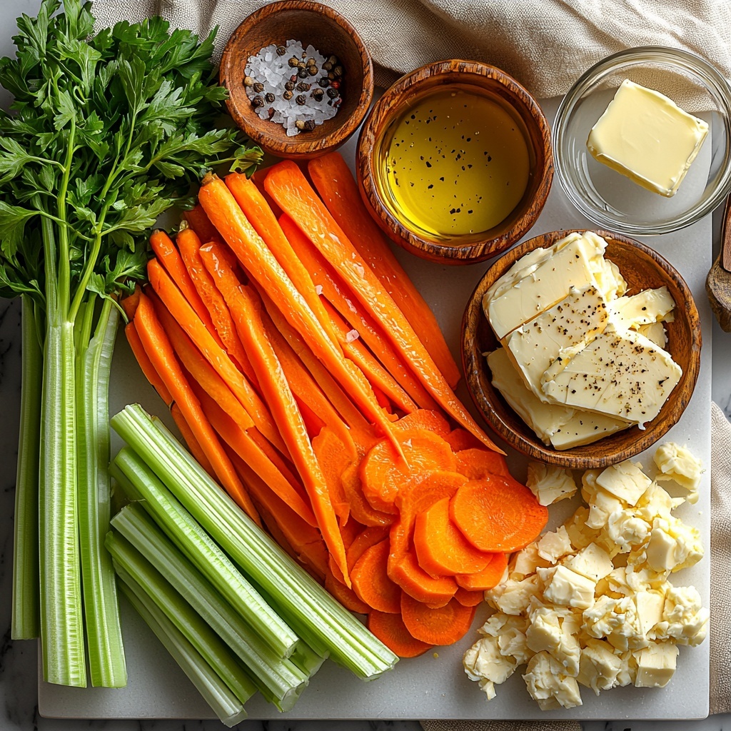 1. Sauté Vegetables: In a large pot or Dutch oven, heat olive oil and butter over medium heat. Add diced onion, carrots, and celery and sauté for 5–7 minutes until vegetables are tender. Add minced garlic and cook for 1 more minute.
