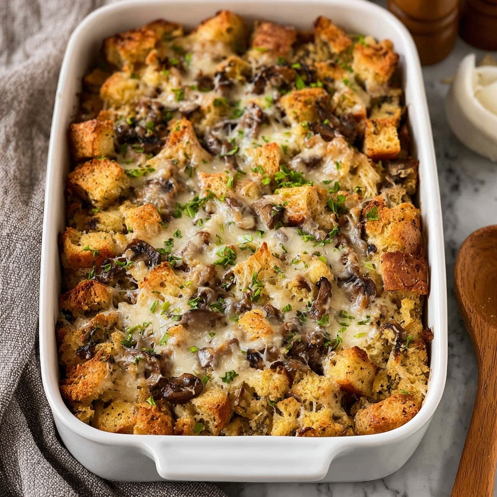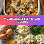 This savory Mushroom & Leek Bread Pudding is a comforting dish featuring toasted artisan bread cubes combined with sautéed pancetta, tender leeks, and cremini mushrooms, all soaked in a rich custard of eggs, half and half, and chicken stock. Topped with melted Gruyère cheese and baked to golden perfection, it makes a perfect side dish or vegetarian-friendly main when pancetta is omitted.