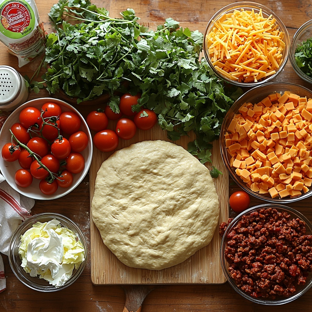 Once out of the oven, let the pizza cool for a couple of minutes to make slicing easier. Then, crown it with your diced tomatoes and shredded lettuce. These fresh ingredients add a lively crunch and balance the richness beneath. Finish it off with dollops of sour cream or Greek yogurt, and sprinkle some chopped cilantro or green onion for that final pop of freshness that makes each slice unforgettable.