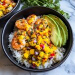- Assemble the bowls: Start by spooning cooked rice or quinoa into bowls as the base. Top with grilled shrimp and sliced avocado. Spoon chilled mango salsa over the top.