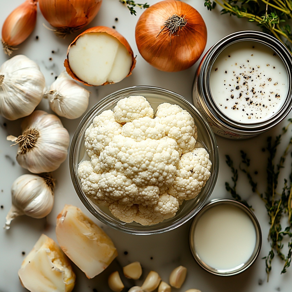 Gathering the right ingredients is crucial, but the beauty of this Vegan Cauliflower Soup Recipe lies in its simplicity. Each item is chosen to enhance the soup’s smooth texture, vibrant color, and rich flavor profile without overwhelming the palate.